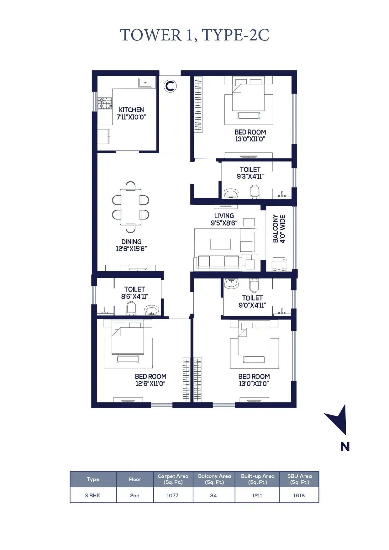 3 BHK: 1046 Sq. Ft. ; 4 BHK: 1362 & 1607 Sq. Ft.