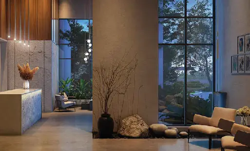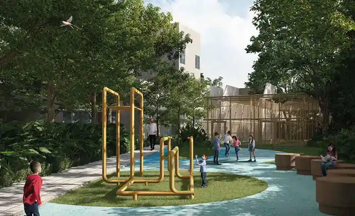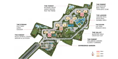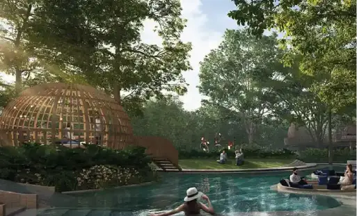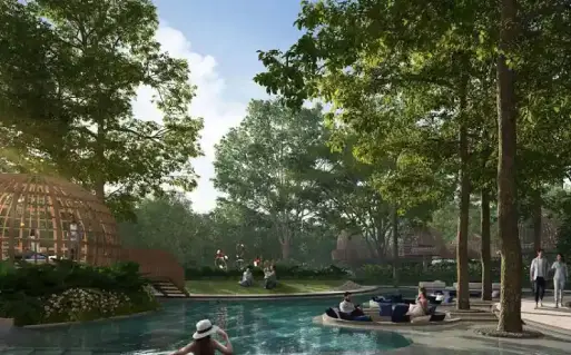 Stay active in the open-air outdoor gym or relax by the leisure pool. The outdoor alfresco areas are perfect for dining and socializing in the fresh air, while comfortable seating areas invite you to lounge and enjoy your surroundings. The amphitheater serves as a venue for events and performances, and the forest trail offers a peaceful escape into nature.